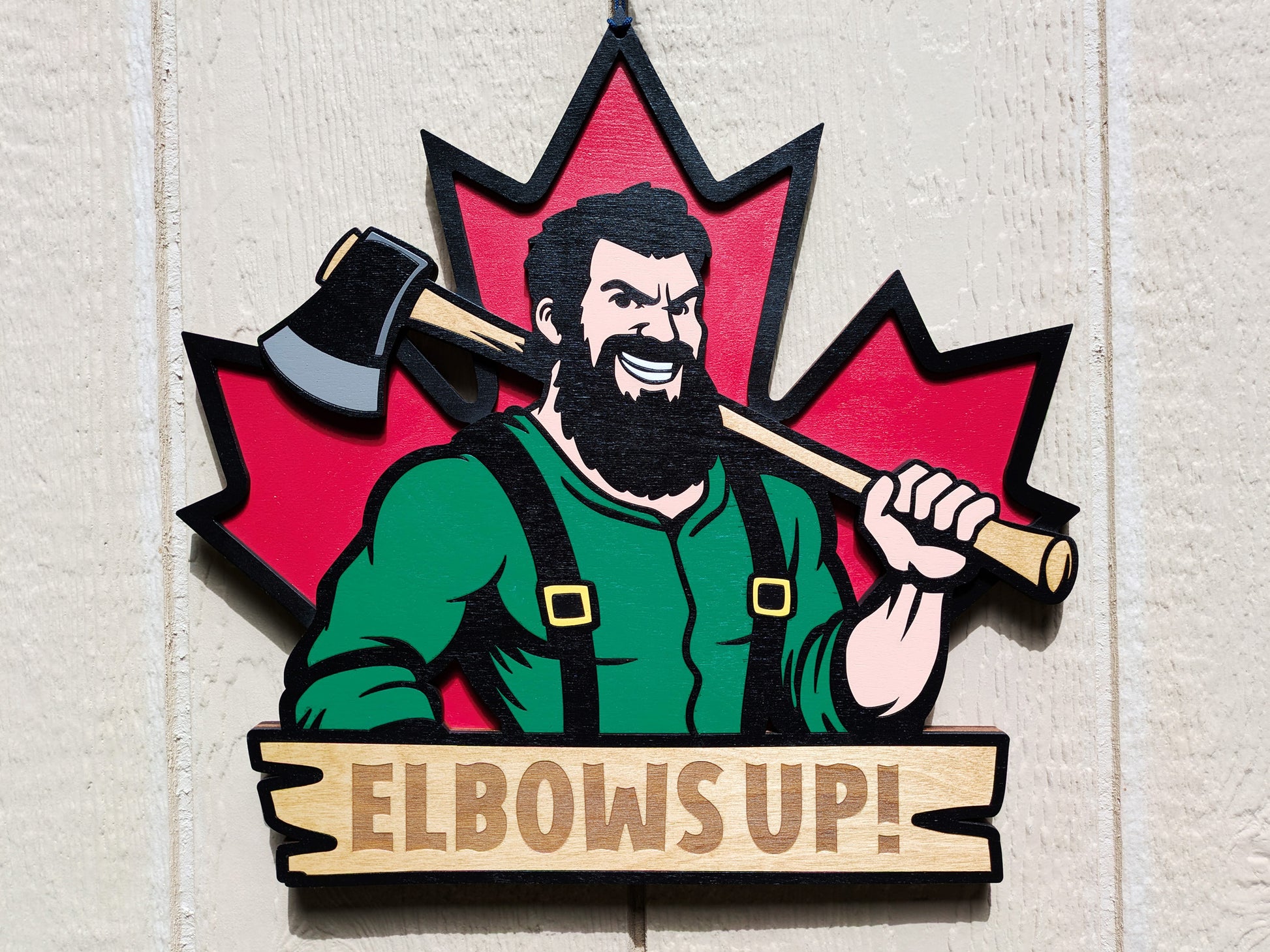 Show your Canadian pride with your Elbows Up Canada Door Hanger! Made from wood, this sign is painted and finished so it will look great for a long time!