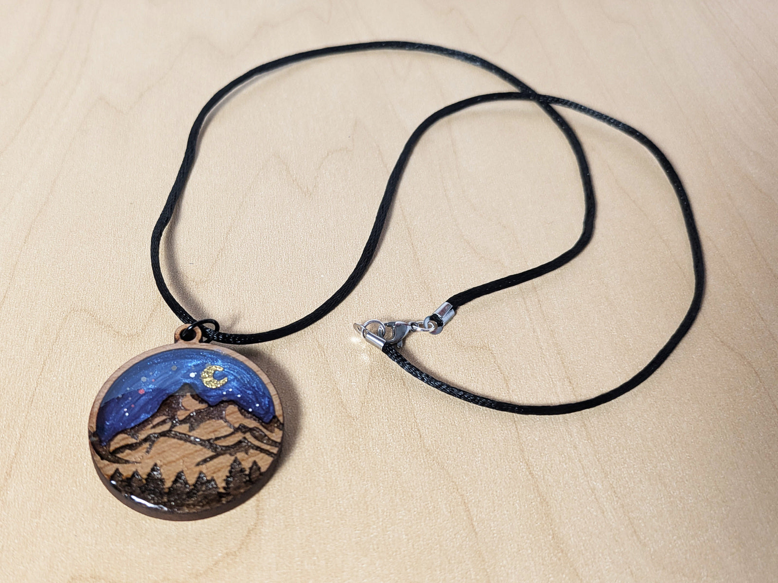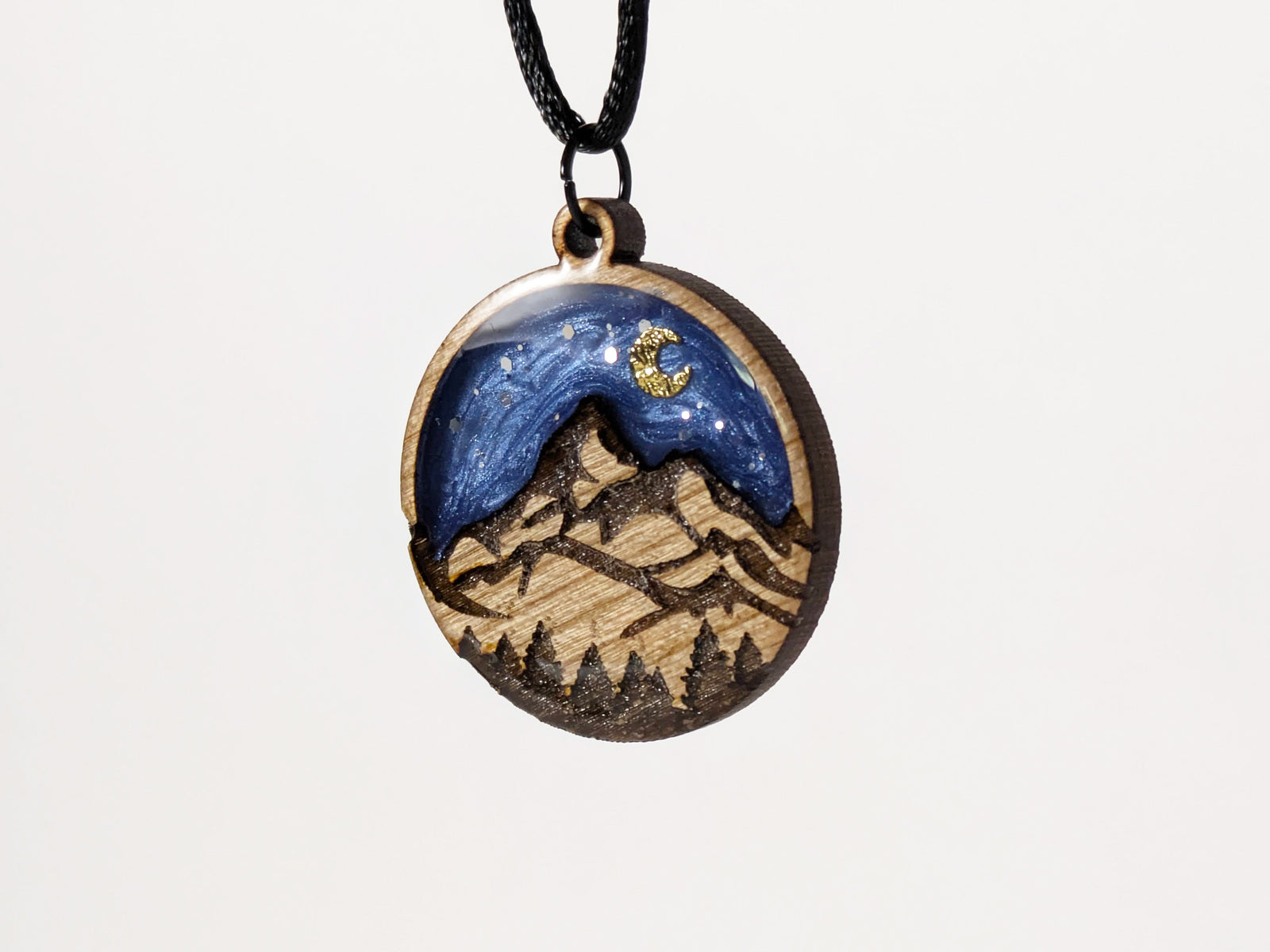 The peace of an evening in the mountains is captured in this beautiful hand-made pendant. Created with engraved wood and resin, this piece reflects the tranquility of the night.